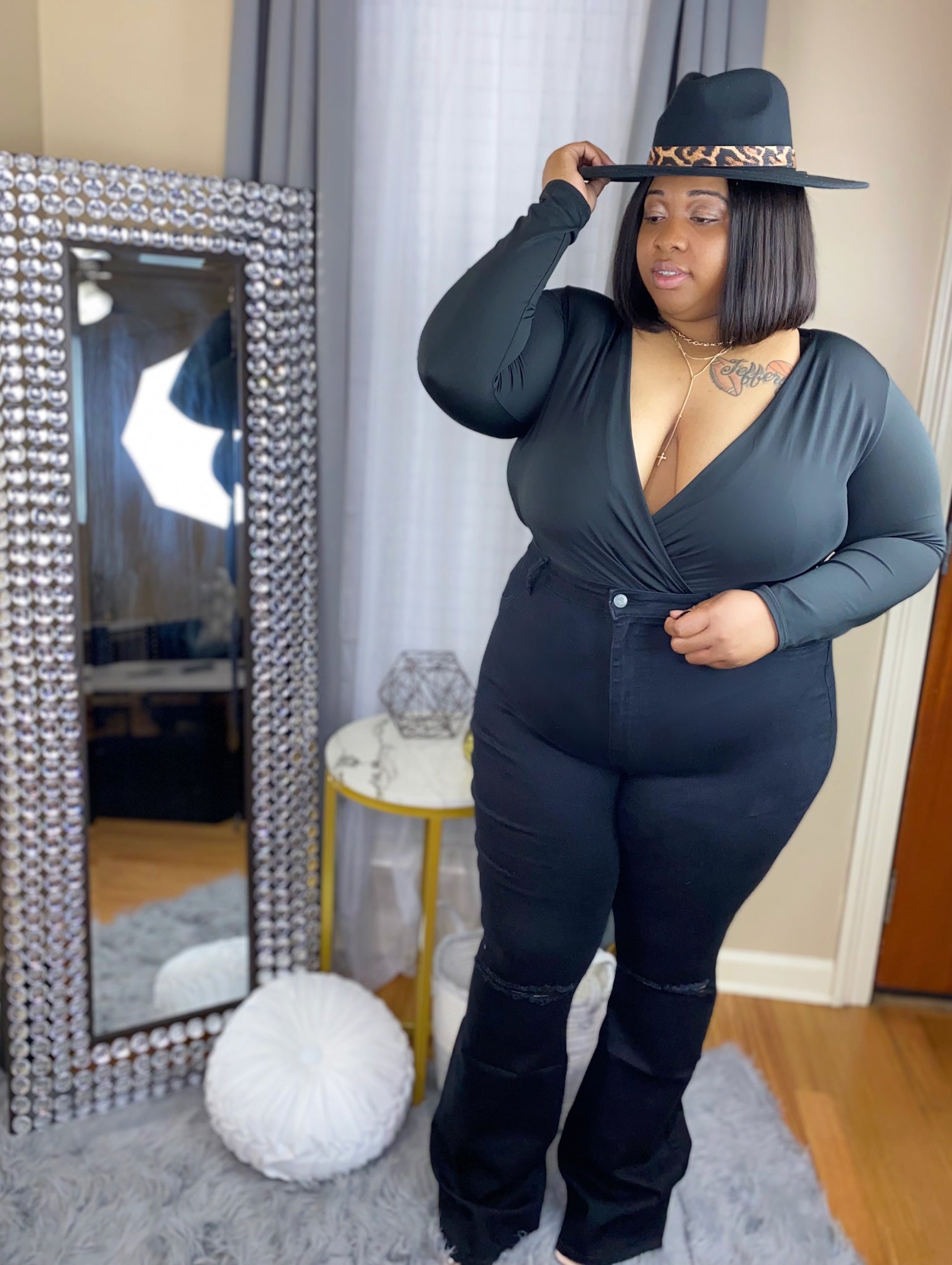 HIGH RISE FLARE LEG BLACK DENIM JEANS.