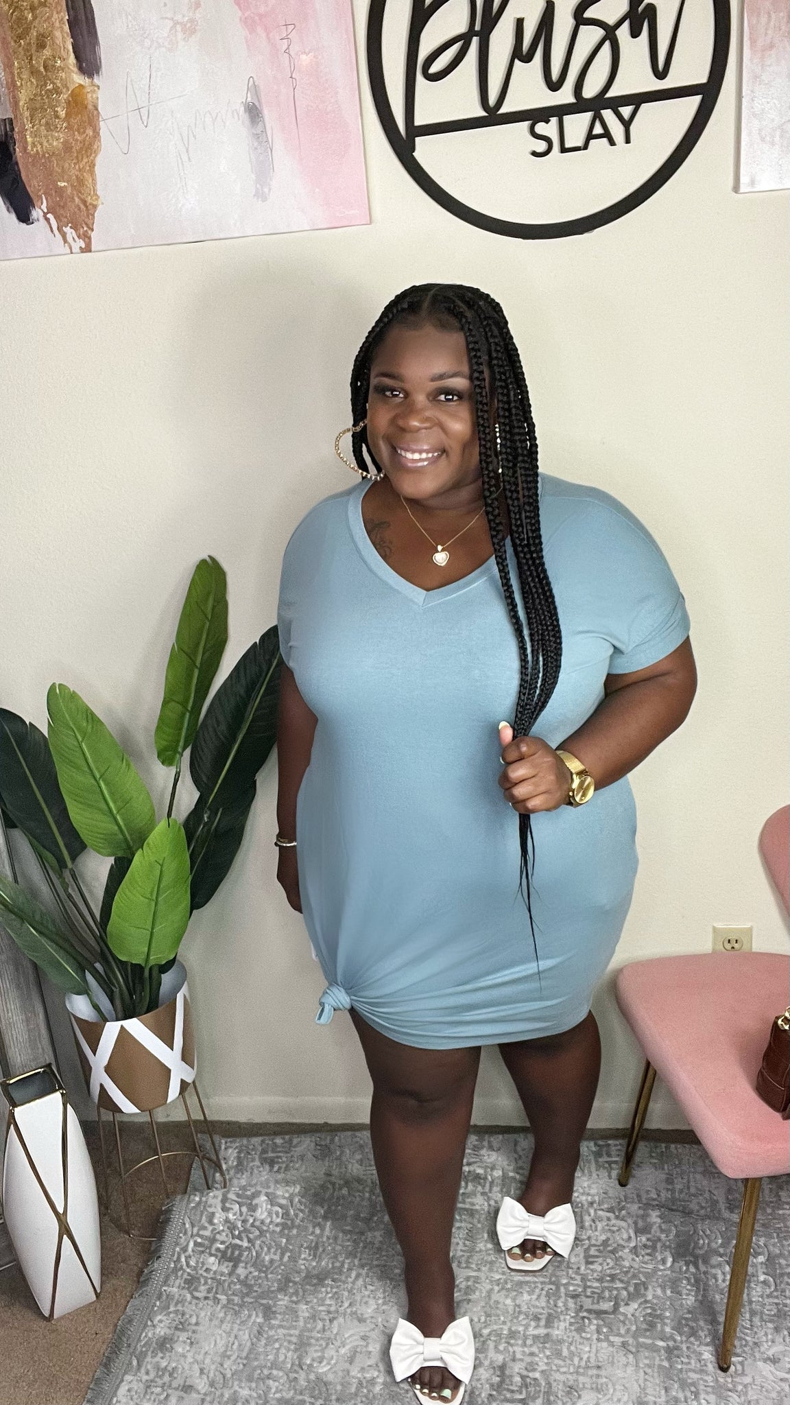 ROLLED SHORT SLEEVE V-NECK DRESS WITH SIDE POCKETS