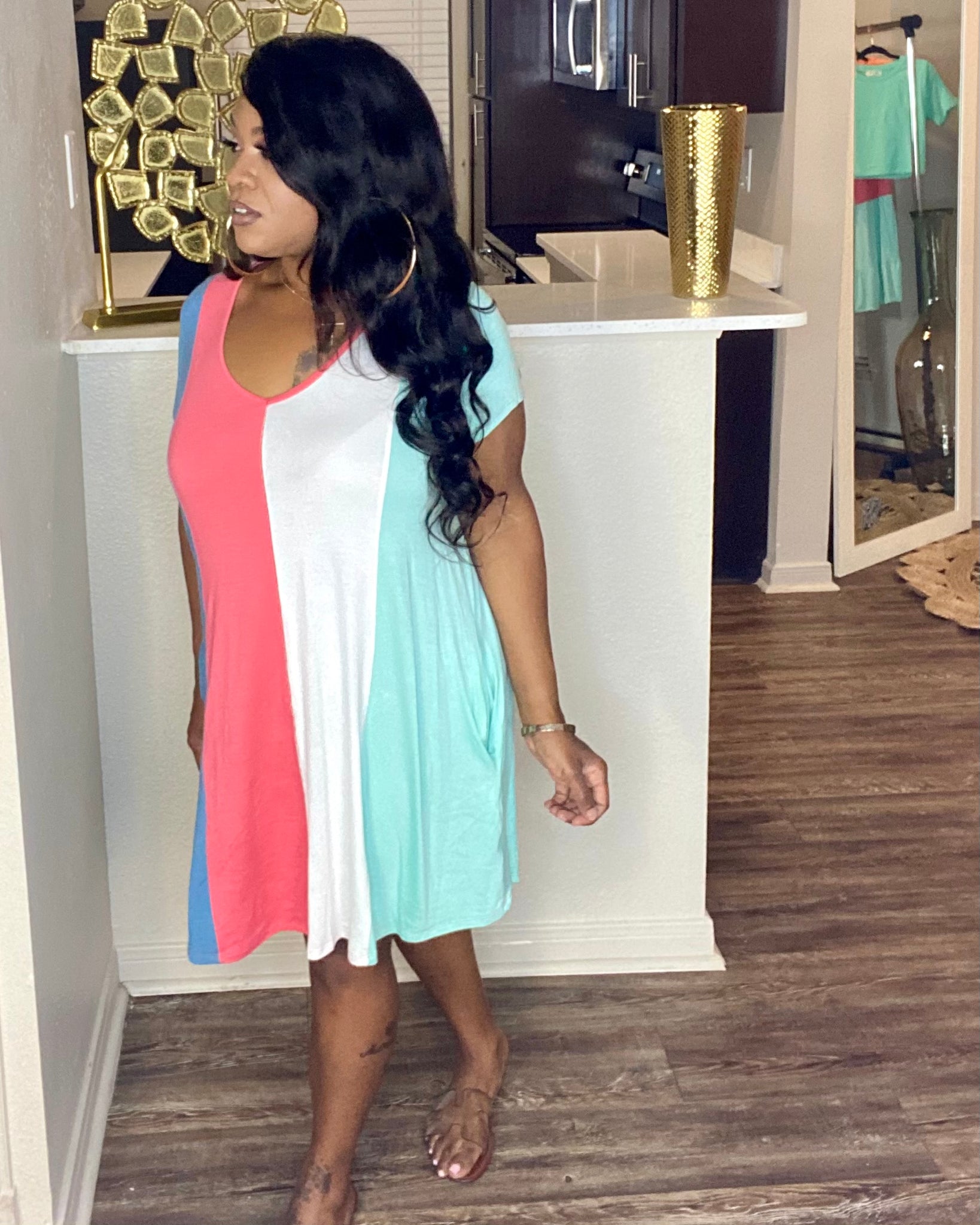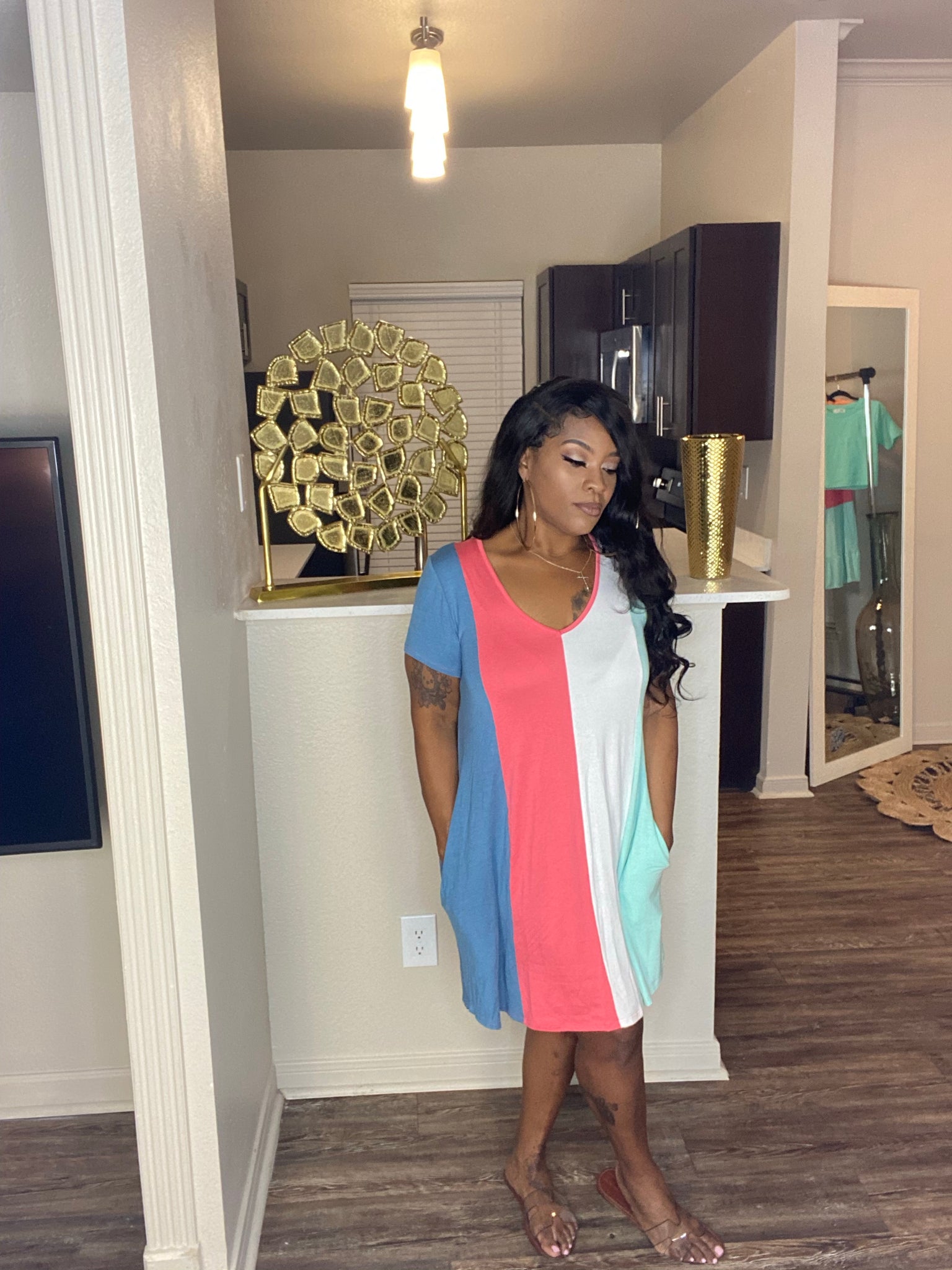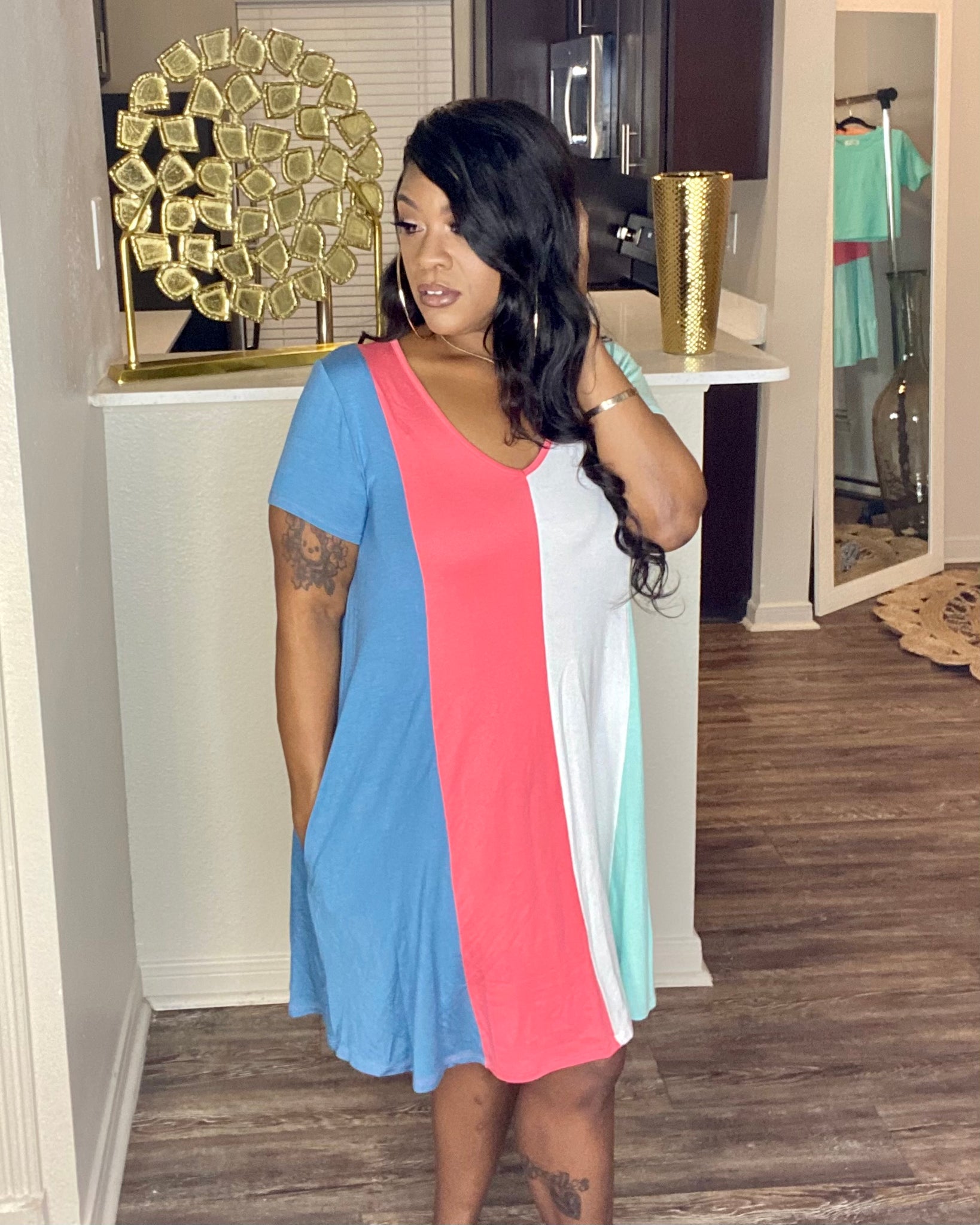 Color block mini dress with deep v neckline and pockets