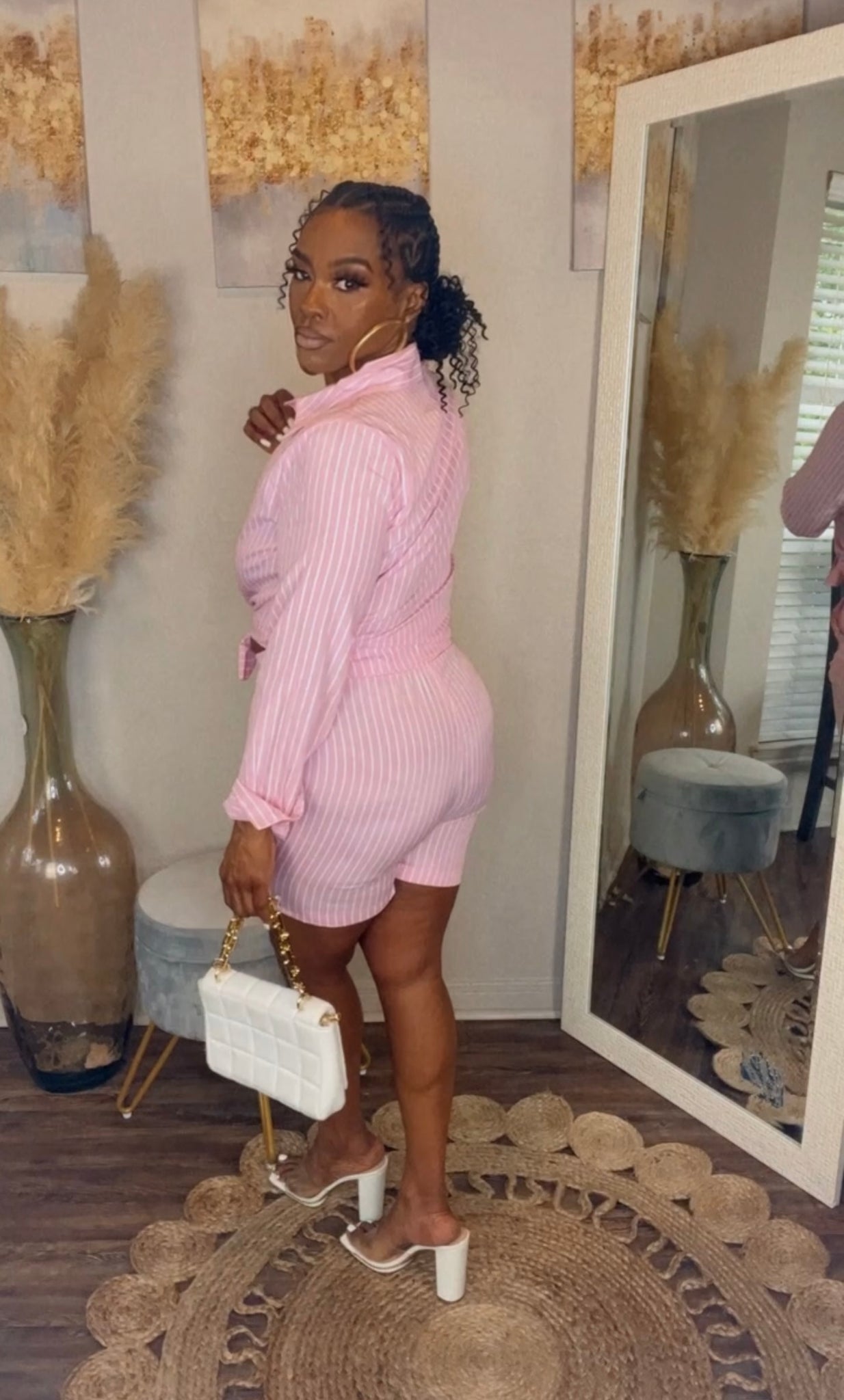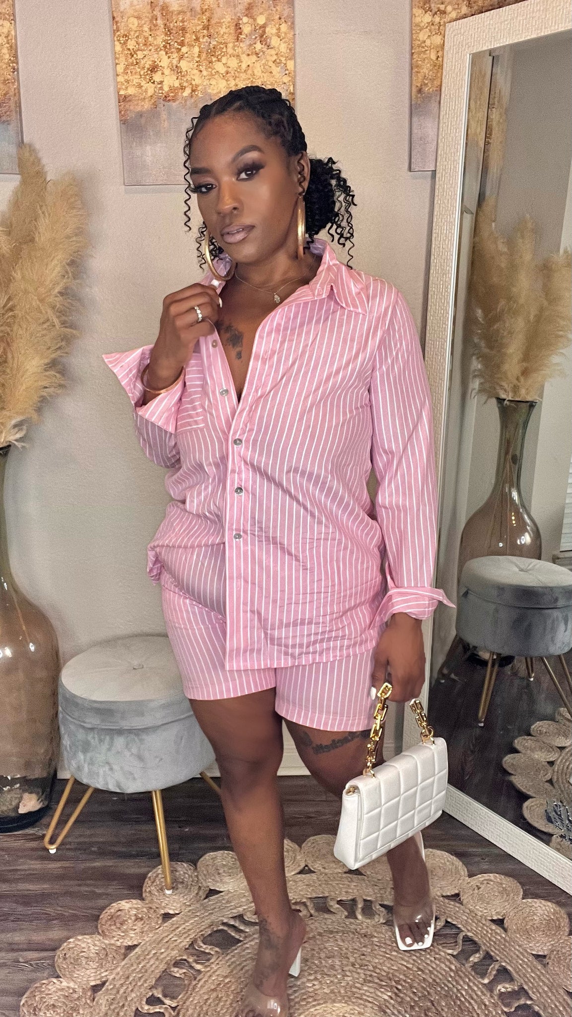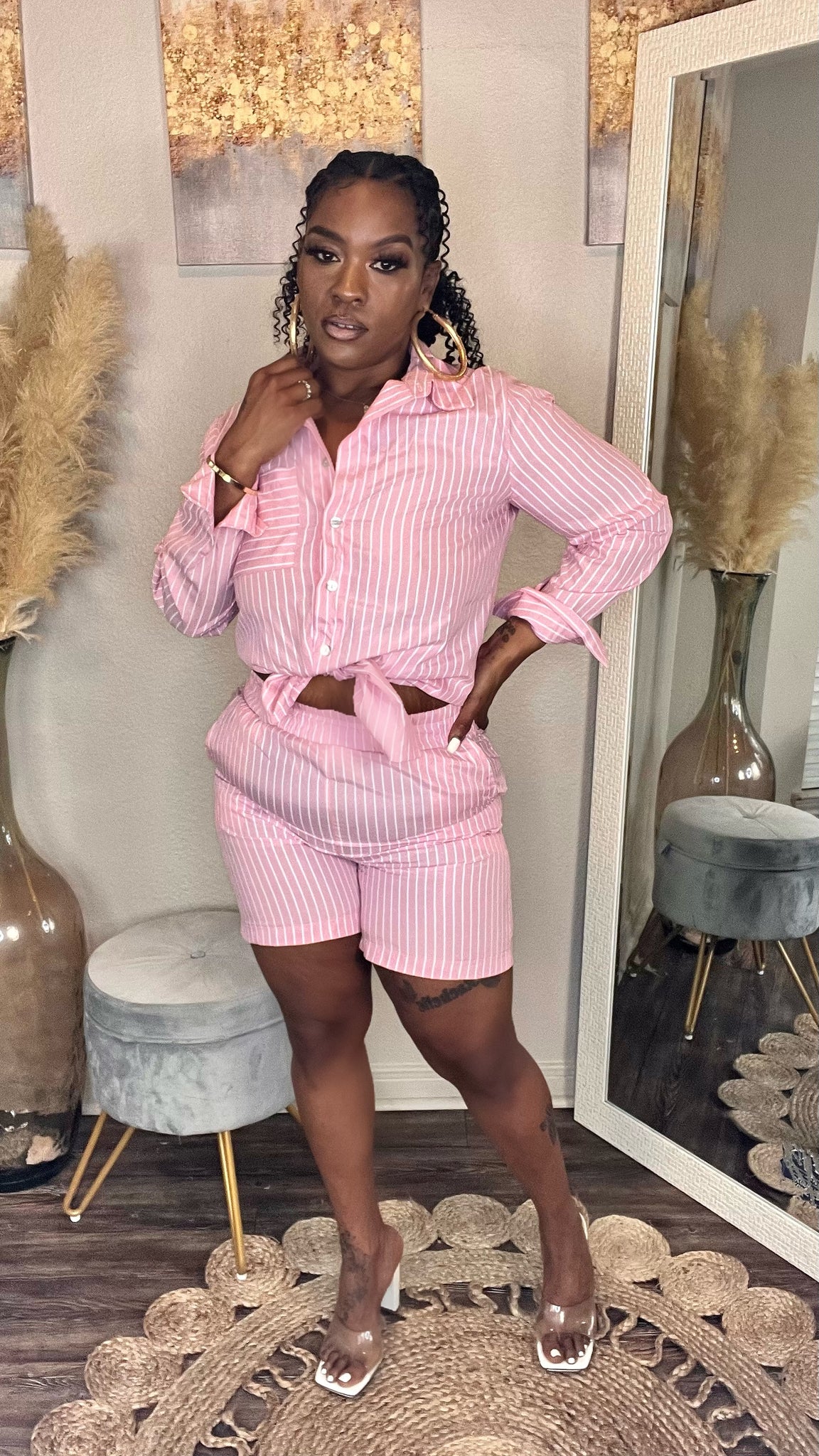 plus woven stripped long sleeve shirt and matching elastic waist shorts.