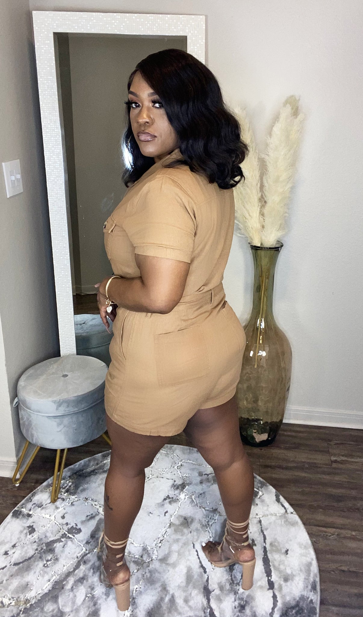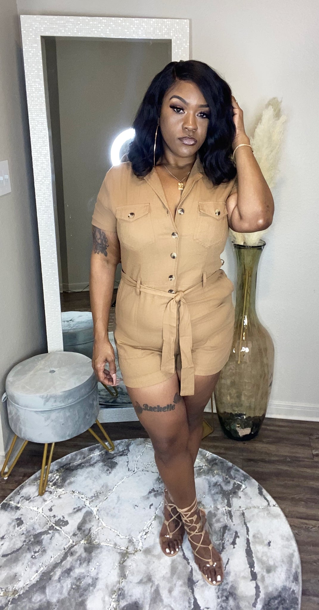 Linen button front belted shirt romper with pockets-removable tie belt- chest button-flap pockets- side & back pockets- front button closure
